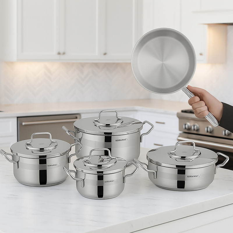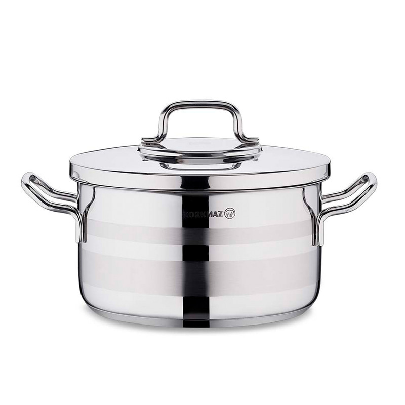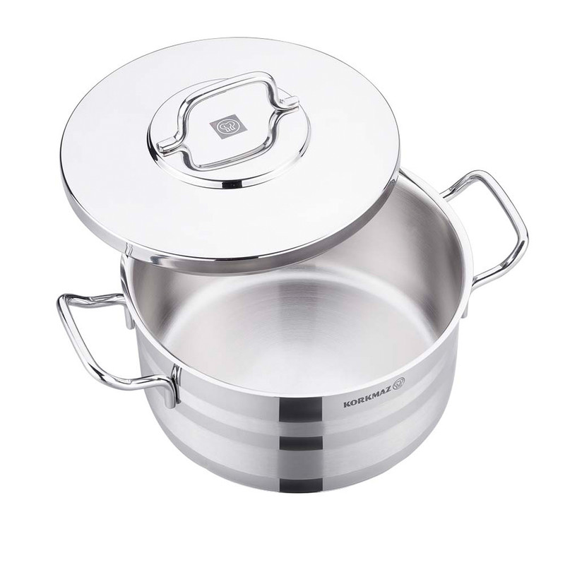سرویس قابلمه کرکماز a2050 یک سرویس زیبای 9 پارچه از برند کرکماز است که دارای 3 قابلمه دربدار به گنجایشهای 1.8 ، 3.3 ، 5.75 لیتر و سایزهای 16، 20، 24 وهمچنین یک ماهیتابه دسته دار به گنجایش 2.7 لیتر سایز 24 و یک ماهیتابه درب دار با گنجایش 3.5 لیتر سایز 24 سانتی متر است که دست شما را برای پخت و پز انواع غذاها باز نگه میدارد. سرویس قابلمه a2050 از جنس استیل ضد زنگ 18/10 (کروم-نیکل) بوده که این نوع استیل به دلیل وجود 18 درصد کروم و 10 درصد نیکل، بسیار با کیفیت و محکم است. کف قابلمهها و تابه دربدار به صورت سوپر کپسولی و با ضخامت 8 میلیمتر ساخته شده است. سطوح آلومینیومی مخصوص برش خورده روی پایه کپسولی هدایت گرما را بهتر کرده است. سرویس قابلمه کرکماز مدل پرولاین دارای دستگیرههایی از جنس استیل ضد زنگ و طراحی ارگونومیک است که در هنگام جابهجایی بسیار راحت است. دربهای این ست نیز از جنس استیل ضد زنگ است که به خوبی گرما در داخل قابلمهها نگه میدارد. سرویس کرکماز به دلیل پایه القایی که دارد، قابلیت استفاده بر روی انواع گاز را دارند. این محصول را به راحتی میتوان در ماشین ظرفشویی قرار داده و شستشو داد.این محصول ساخت کشور ترکیه است.