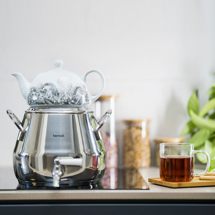 صفحه (دیسک) فشرده سه لایه در کف محصول، حرارت را سریع تر و به طور یکنواخت در سطح ظرف پخش می کند و باعث جلوگیری از تجمع گرما در یک نقطه می شود مطمئن برای استفاده بر روی انواع اجاق گاز گنجایش کتری: 5 لیتر گنجایش قوری: 1 لیتر نگهداری: از قرار دادن کتری خالی بر روی اجاق داغ خودداری نمایید قوری را هرگز بر روی حرارت مستقیم قرار ندهید بر روی شعله ی کم و کوچکتر از اندازه کف کتری قرار گیرد توصیه می شود با آب گرم و مایع ظرفشویی شسته شود و پس از آبکشی، با حوله نرم خشک شود برای شستشو از سیم ظرفشویی و اسکاچ های زبر استفاده نکنید. برای بهترین نتیجه، با پارچه و یا اسفنج نرم نظافت شود. ساخته شده از: کتری، درپوش و دستگیره ها از جنس استیل ضد زنگ 10/18 قوری از جنس چینی شیر کتری ترکیبی از استیل ضد زنگ و پلی آمید