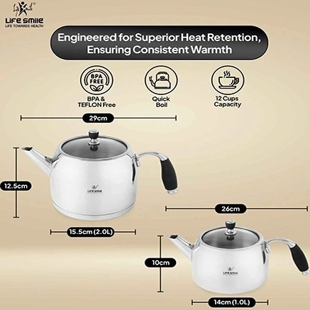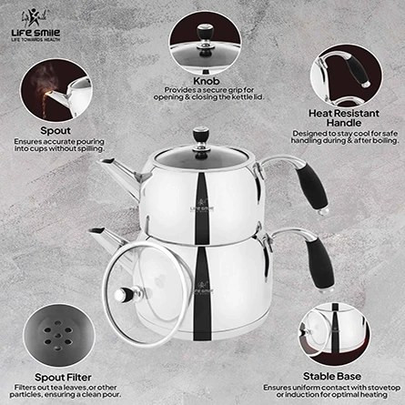 کتری و قوری لایف اسمایل مدل TK1 7G با طراحی زیبا و رنگ طلایی که دارد جلوهای خاص به آشپزخانه شما خواهد داد. این ست زیبا شامل کتری 2 لیتری و قوری 1 لیتری است که برای یک خانواده با جمعیت متوسط ایدهآل خواهد بود. جنس بدنه کتری و قوری از استیل ضد زنگ 18/10 (نیکل-کروم) ساخته شده است. این استیل شامل 18 درصد کروم و 10 درصد نیکل بوده که علاوه بر استحکام و زیبایی آن در برابر هر گونه خط و خش نیز مقاوم است.