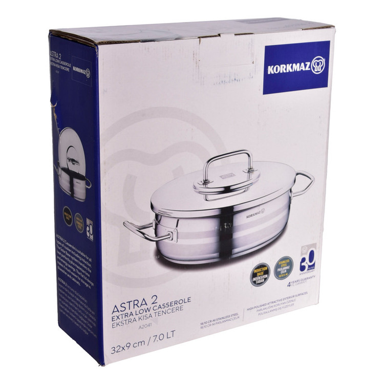 تابه استیل کرکماز مدل آسترا ASTRA2 A2041 محصولی از برند زیبای KORKMAZ کشور ترکیه است. جنس این تابه از استیل ضد زنگ نیکل-کروم 1018 ساخته شده که علاوه بر ظاهری زیبا و براق دارای بدنه ای مستحکم نیز می باشد. جنس درب تابه و دستگیره ها نیز از استیل ضد زنگ است. دستگیره ها دارای نوعی اتصال هستند که در اثر حرارت داغ نمی شوند و همچنین دارای طراحی ارگونومیک هستند که کار با آن ها بسیار راحت است. تابه استیل KORKMAZ ASTRA2 A 2041 دارای سایز 9*32 سانتی متر و ظرفیت 7 لیتر می باشد. ماهیتابه کرکماز مدل 2041 دارای سیستم پایه خورشیدی است که به لطف آن دارای بالاترین سطح انتقال حرارت بوده و همچنین بر روی انواع اجاق ها از جمله القایی قابل استفاده است. این تابه استیل کرکماز مدل آسترا ASTRA2 A2041 قابل استفاده در مایکروویو بوده و همچنین برای شستشو می توانید داخل ماشین ظرفشویی قرار دهید. از دیگر مزیت های تابه کرکماز مدل آسترا 2041 درب مسطح آن است که برای نگهداری و همچنین داخل ماشین ظرفشویی فضای زیادی را اشغال نمی کند. این تابه دو دسته استیل KORKMAZ ASTRA2 A 2041 دارای سایز 9*32 سانتی متر و ظرفیت 7 لیتر می باشد. این ماهیتابه کرکماز مدل 2041 دارای سیستم پایه خورشیدی یا همان القایی نیز می باشد که به لطف آن دارای بالاترین سطح انتقال حرارت بوده و همچنین بر روی انواع اجاق ها از جمله القایی قابل استفاده است.