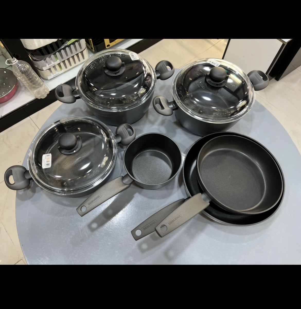 سایز ها: قابلمه ۲۴ دو عدد تابه دو دسته ۲۴ یک عدد تابه تک دسته ۲۸ یک عدد تابه تک دسته ۲۴ ۱ عدد شیر جوش ۱۴ یک عدد